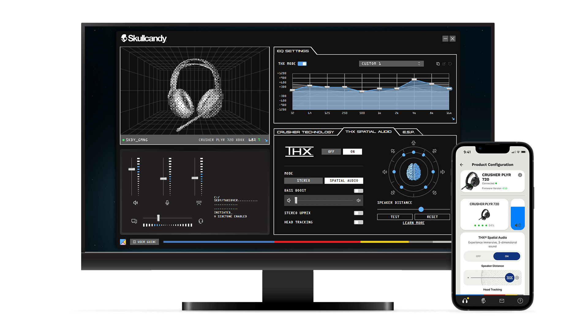 Skull-HQ is Skullcandy’s desktop application that gives you complete control over your audio experience across desktop and mobile. You can customize the 10-band EQ, adjust game/chat mix, fine-tune your spatial settings, and personalize your sound profile. Want more bass? The dedicated Crusher EQ lets you crank the feel exactly how you like it — no matter what you’re playing or listening to.