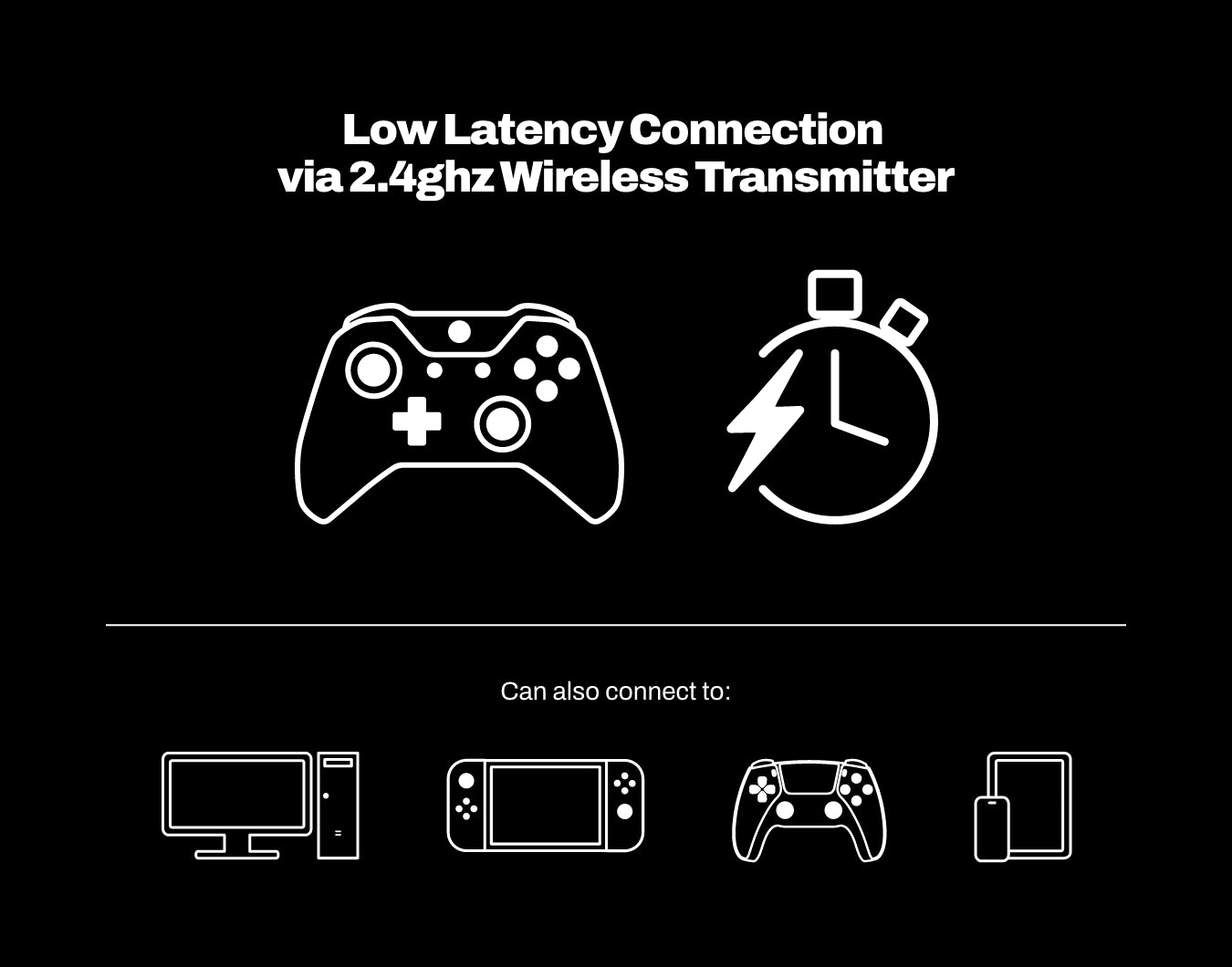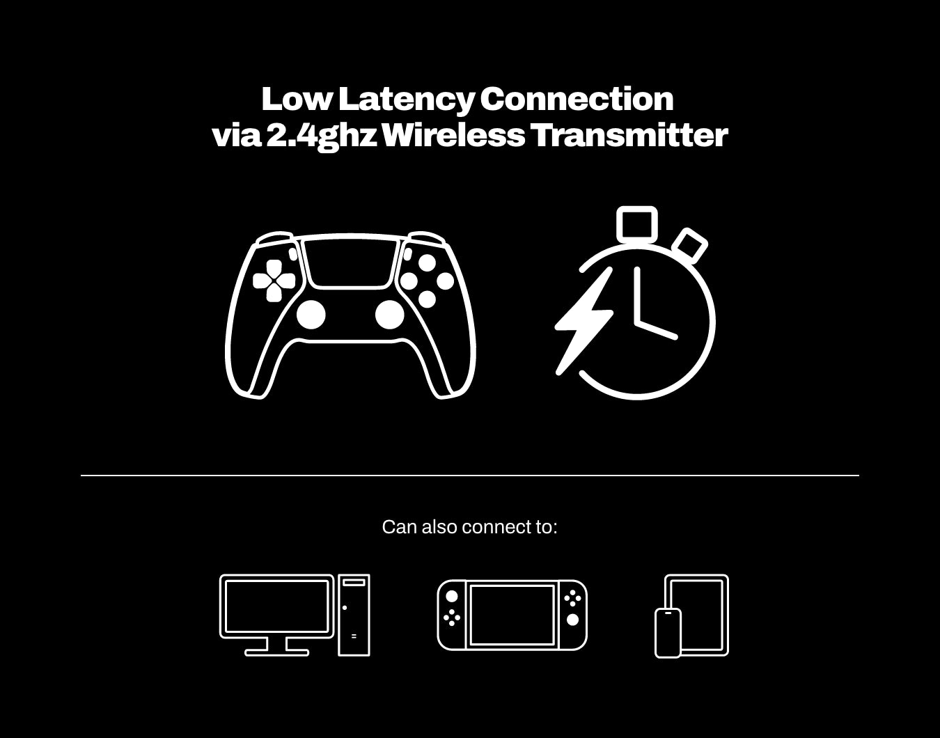 Connect to PlayStation using the included Ultra-Low-Latency Wireless Transmitter. Also enjoy wireless compatibility with PC, Nintendo Switch™, and mobile gaming.