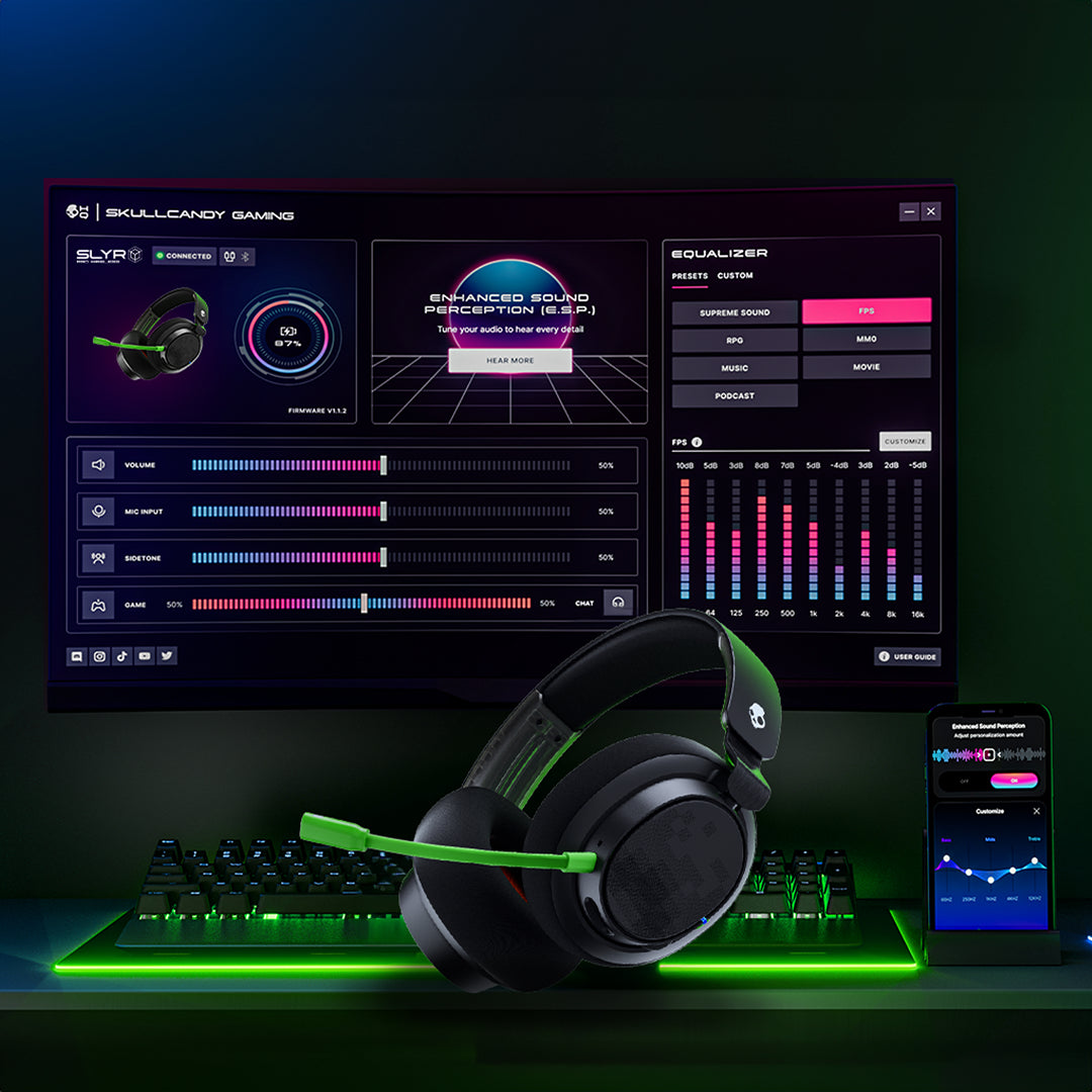 Advanced features like ChatMix, EQ and sidetone adjustment can be controlled via Skullcandy software, available for desktop or mobile.